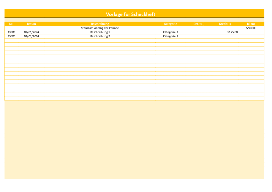 ScheckheftErhalten Sie ein vorgefertigtes Scheckregister, indem Sie die Vorlage bearbeiten oder es einfach im XLSX-Format herunterladen.
