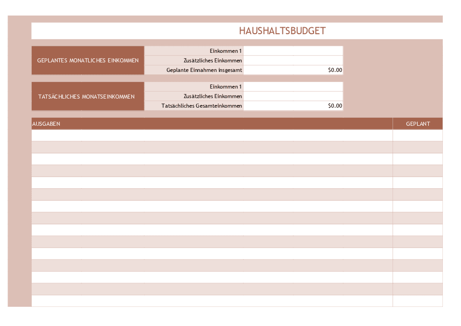 HaushaltsbudgetErhalten Sie einen fertigen Haushaltsbudget-Tracker, indem Sie die Vorlage bearbeiten oder ihn einfach im XLSX-Format herunterladen.
