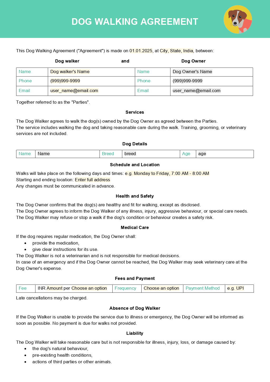 Establish clear terms between dog walkers and owners with this simple agreement. Define service scope, schedule, health responsibilities, fees, and emergency procedures to ensure safe and professional pet care.