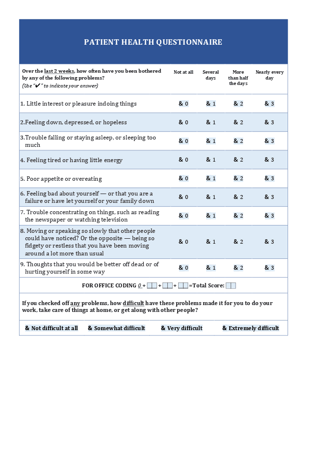 Patient Health Questionnaire 9 (PHQ 9) formFill out the form and get a PHQ 9 ready online, or just download the fillable template in DOCX or PDF
