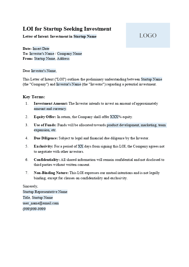 Letter of Intent for startup investment 1Get a ready-made LOI for startup investment template 1 online or just download it in PDF.