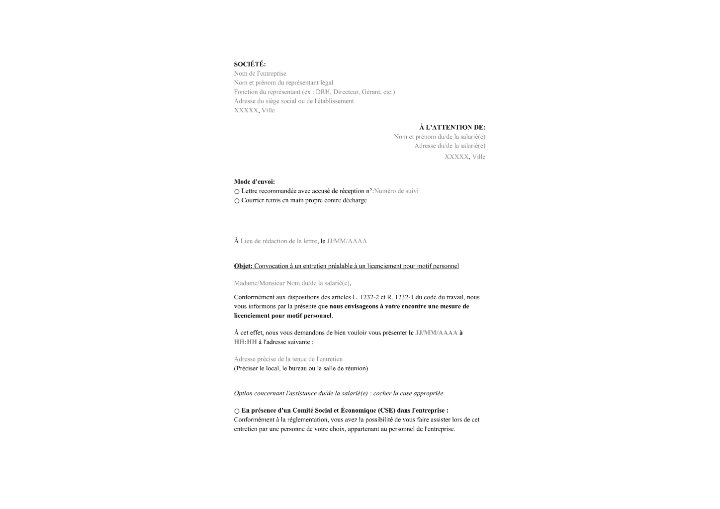 Obtenez un modèle de convocation à un entretien préalable au licenciement pour motif personnel prêt à l'emploi en ligne ou téléchargez-le au format PDF.