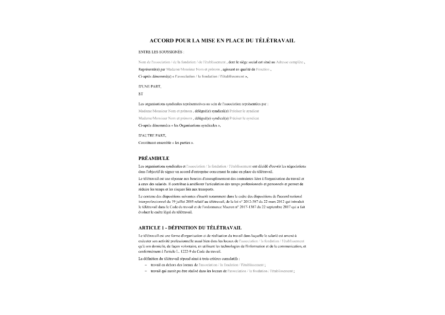Accord pour la mise en place du télétravail Obtenez un modèle d'accord pour la mise en place du télétravail prêt à l'emploi en ligne ou téléchargez-le au format PDF.