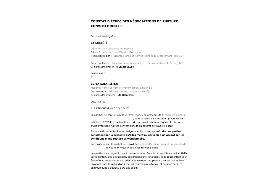 Constat d'échec des négociations de rupture conventionnelle Obtenez un modèle de constat d'échec des négociations de rupture conventionnelle prêt à l'emploi en ligne ou téléchargez-le au format PDF.