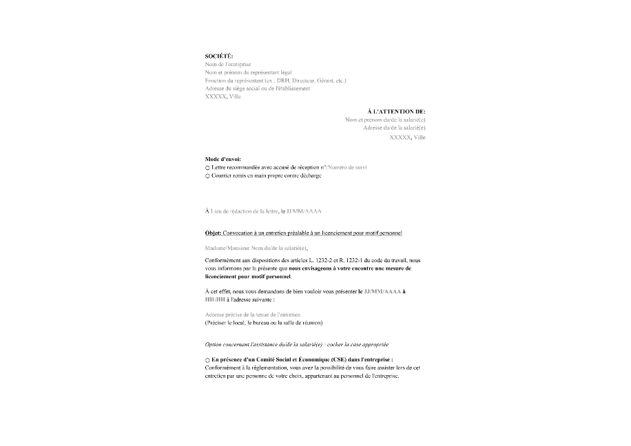 Convocation à un entretien préalable au licenciement pour motif personnel Obtenez un modèle de convocation à un entretien préalable au licenciement pour motif personnel prêt à l'emploi en ligne ou téléchargez-le au format PDF.