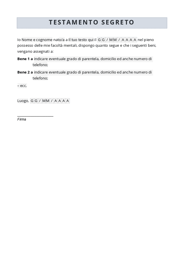 Modulo Testamento segretoCompila il modulo online, ottieni un modello compilabile di Testamento segreto o scarica fac simile
