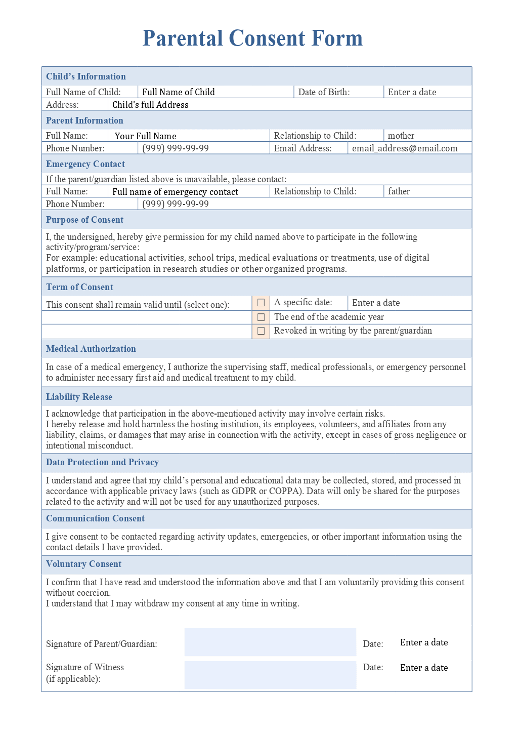 Fill out the form and get a Parental consent form template online, or just download the fillable template in DOCX or PDF.