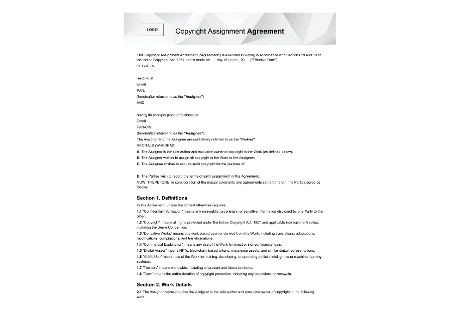 Copyright assignment agreement Get a ready-made Copyright Assignment Agreement template online or just download it in PDF.