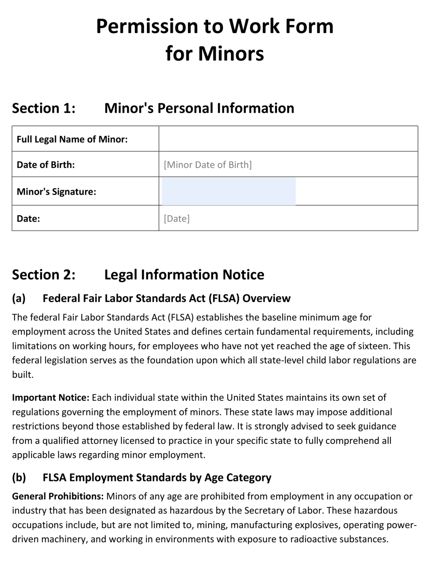 A permission to work form for minors is a legal document that authorizes employment of individuals under 18 years old in compliance with federal and state labor laws. Use this template to document minor's personal information and ensure adherence to Fair Labor Standards Act (FLSA) requirements and hazardous occupation restrictions.