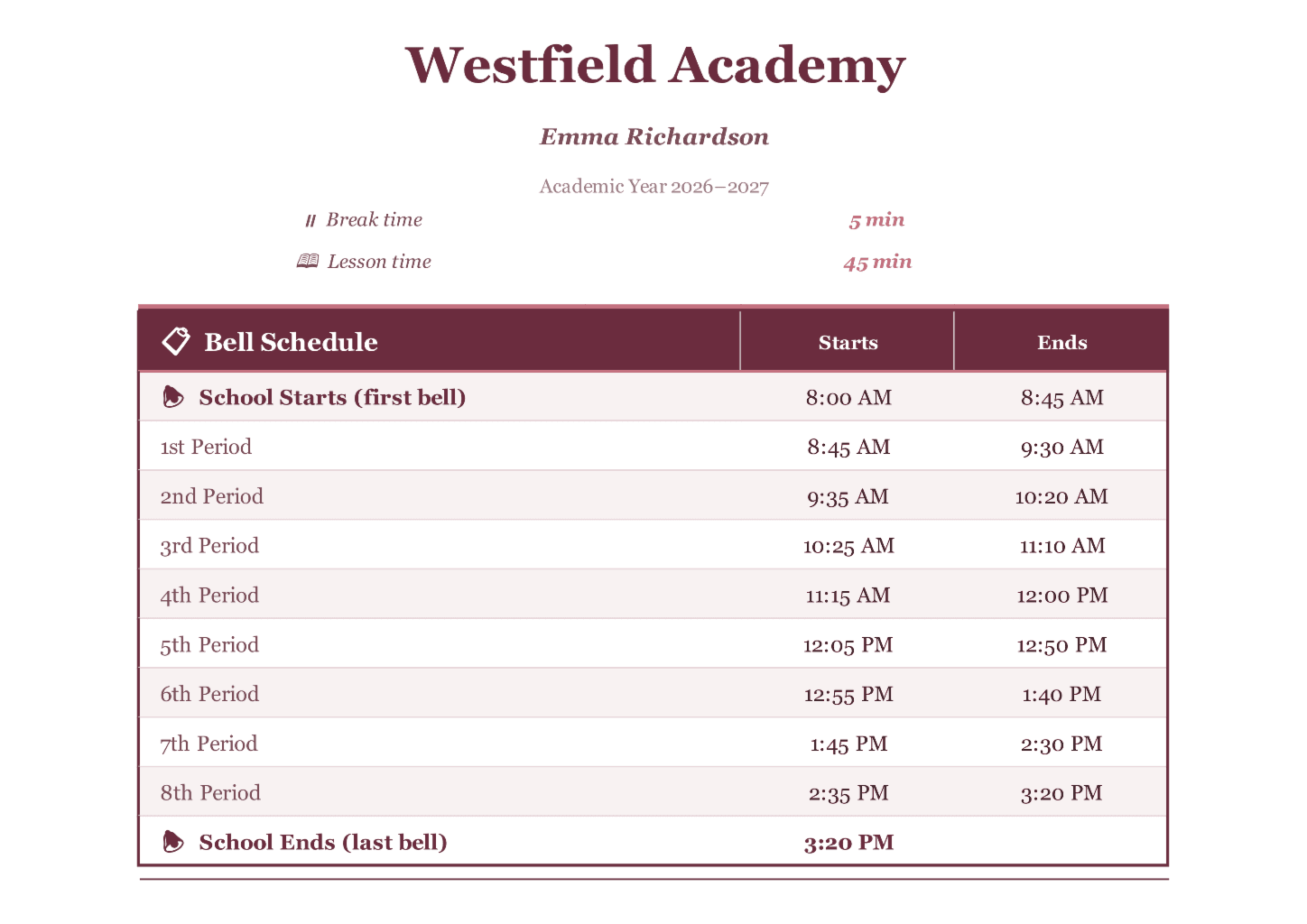 Keep on track of the school schedule with times of bells, breaks, and lunch periods. Use this template to organize class periods and meal times for Westfield Academy's academic year.